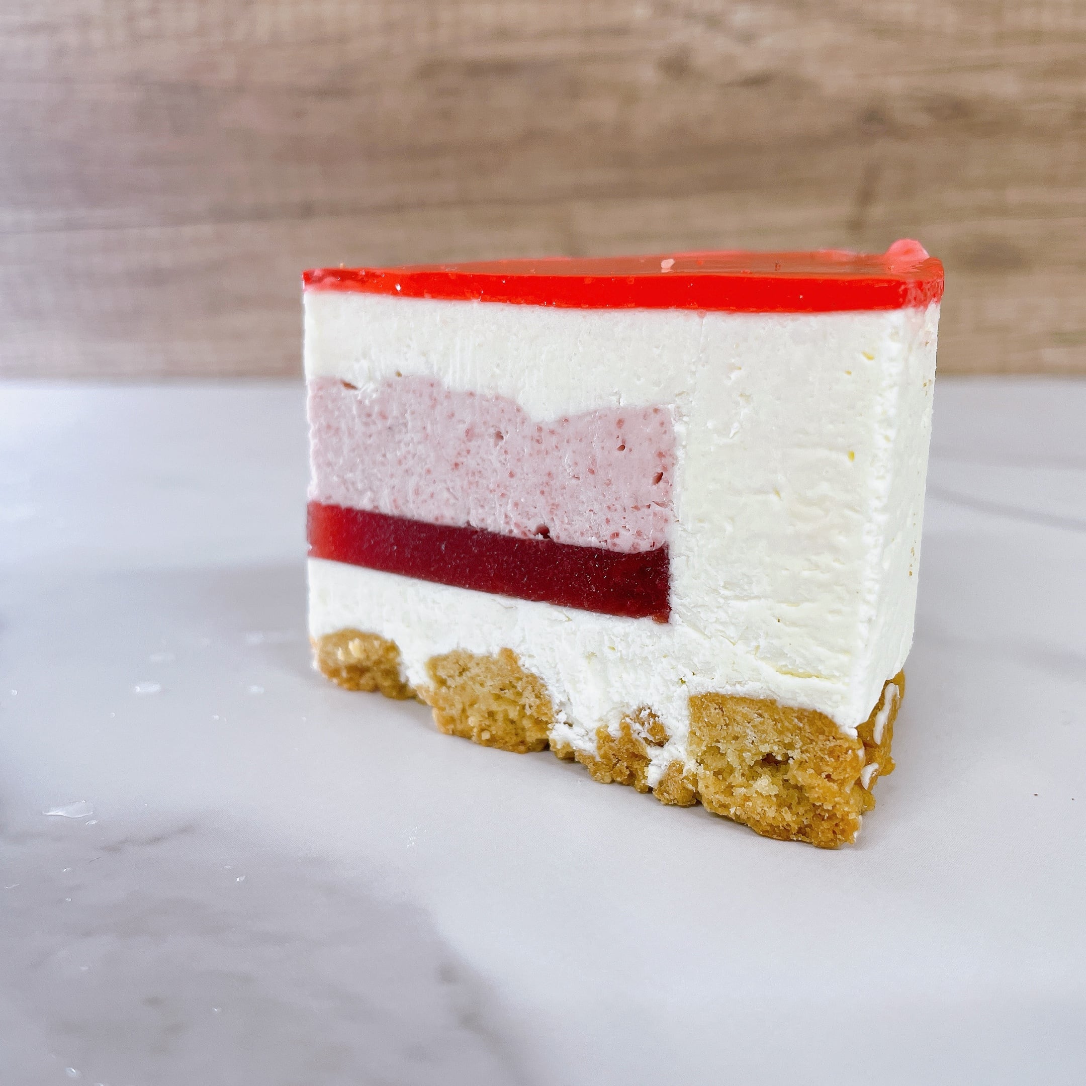 クッキー生地の上にマスカルポーネとホワイトチョコのミルキーなクリーム。真ん中にイチゴソースとイチゴクリームがはいっています。上は赤いコーティングになります。